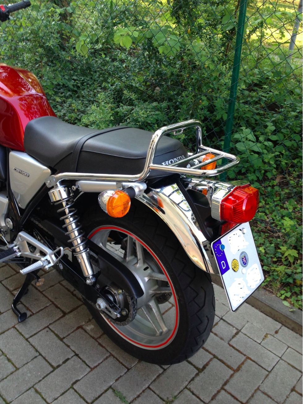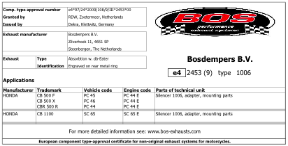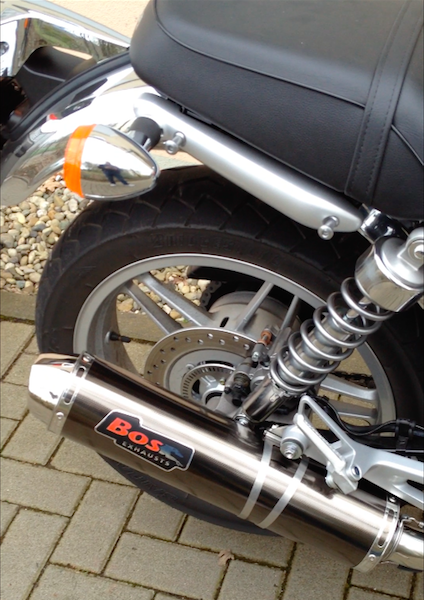 Habe heute einen Endschalldämpfer (ESD) aus dem Zubehörhandel montiert. Der BOS Carbon-Steel wurde bei Tante Louise für 399 Euronen angeboten, klingt etwas dumpfer als das Original. Wiegt nur 3 kg gegen 8,5 kg im Original, der Motor hängt meines Erachtens etwas direkter am Gas. Laut BOS gibt es auch noch mehr kW and Nm, aber das ist wahrscheinlich nur auf dem Prüfstand nachvollziehbar, auf jeden Fall hat der ESD eine e4-Zulassung (BOS-Anlagen kommen aus Holland) für die CB1100. Klingt im direkten Vergleich zur Originalen so (erst die originale, dann die BOS; jeweils ca 20 sek lang)!